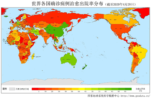 全球確診病例治愈出院率空間分布(截至2020年4月28日)