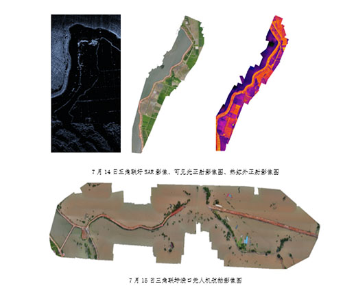 7月12日晚,江西省九江市永修縣西修河三角聯(lián)圩發(fā)生潰堤,針對突發(fā)的重大洪澇災(zāi)情和潛在的險(xiǎn)情,國家重點(diǎn)研發(fā)計(jì)劃項(xiàng)目科研團(tuán)隊(duì)又緊急組織多架無人機(jī)攜帶SAR、光學(xué)相機(jī)、紅外相機(jī)、光電吊艙等多種載荷,克服陰雨不利天氣因素,于7月14日-15日連續(xù)兩天對三角聯(lián)圩開展高精度無人機(jī)組網(wǎng)遙感監(jiān)測。