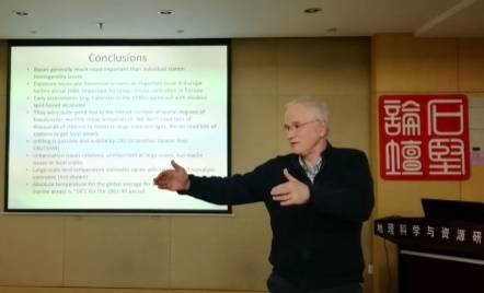 2016年11月1日下午,資源與環境信息系統國家重點實驗室石堅論壇第39講在地理資源所2321 會議室順利舉行。本次論壇報告由王勁峰研究員主持,來自英國東安格里亞大學氣候研究中心的Phil Jones教授和來自國家氣象信息中心的李慶祥研究員分別做了題為“The Reliability of the Global Temperature Record” 和“近百年中國氣溫序列研究的一些進展”的主題報告。