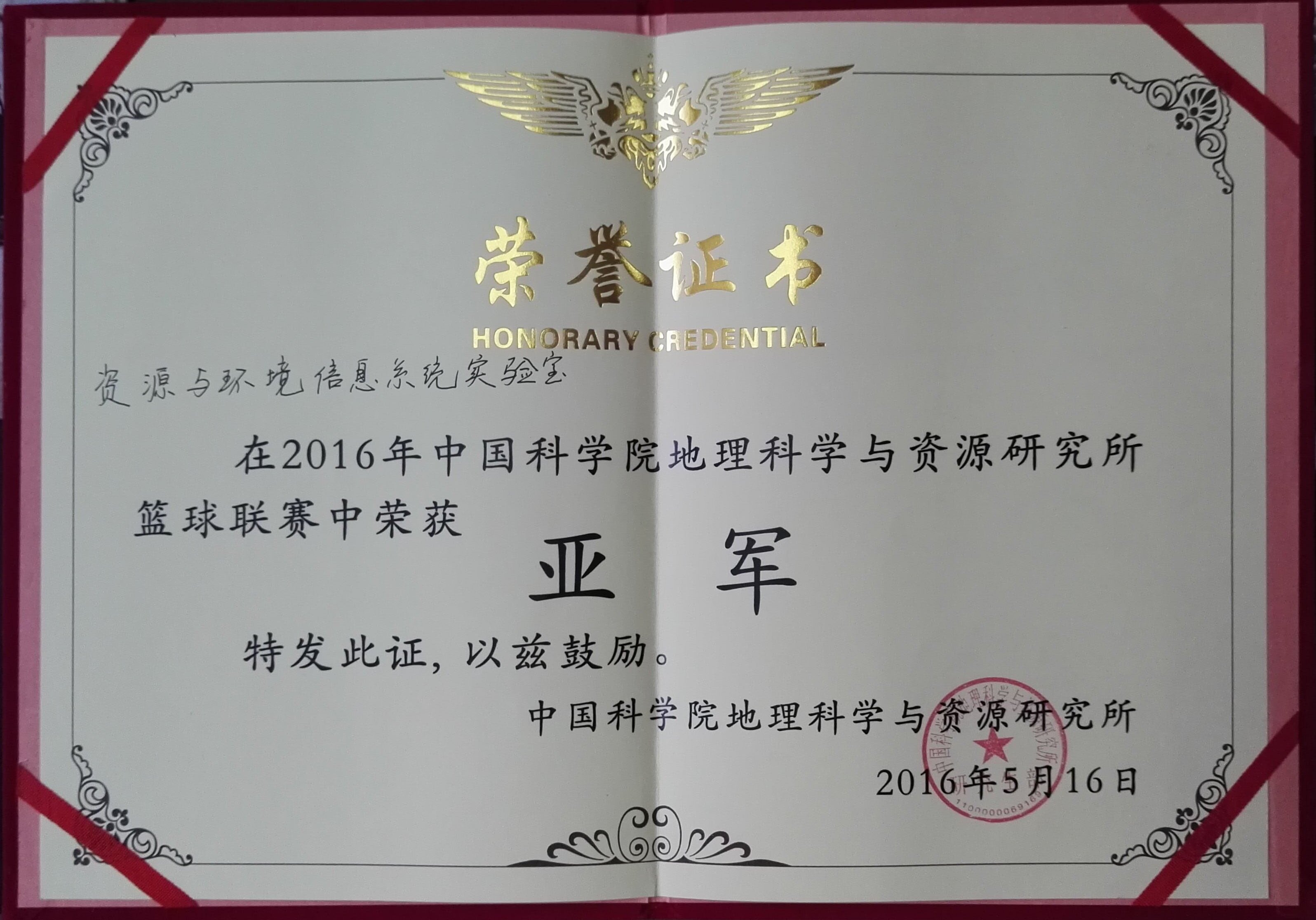地理資源所2016年籃球聯賽上我實驗室榮獲亞軍