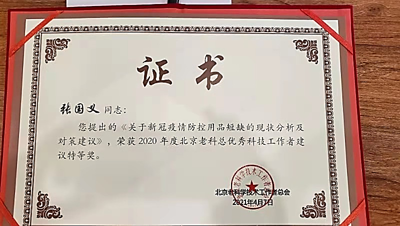 實驗室咨詢報告專家張國義老師榮獲2020年度北京老科總優秀科技工作者建議特等獎。